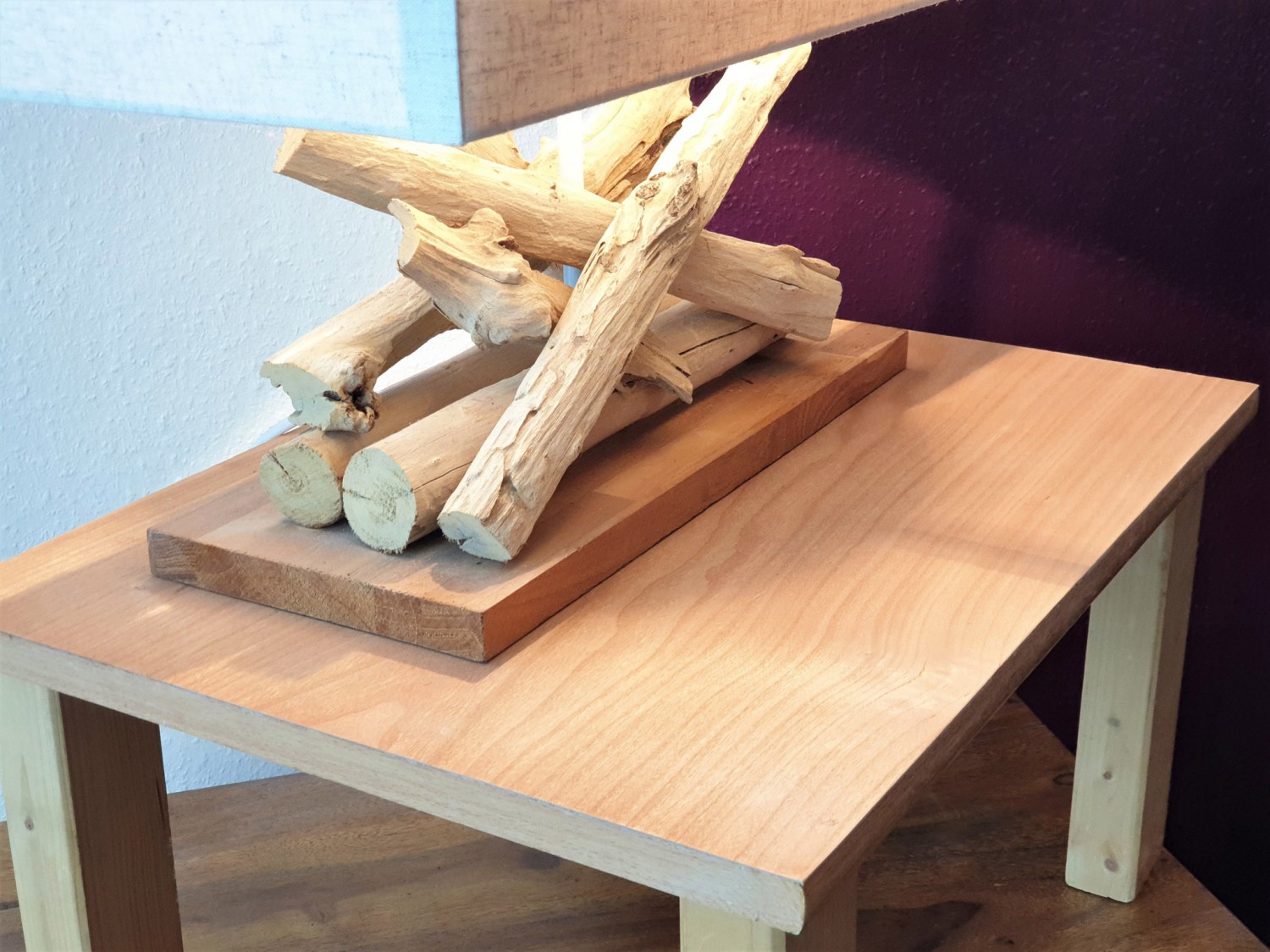 Die Oberfläche des kleinen Tisches ist voller Kratzer und Schrammen. Vier Schrauben sind in der Holzplatte versenkt, um die Tischbeine zu montieren. Diese Vertiefungen stören beim Spielen und sehen hässlich aus. Die Ecken und die Kanten sind ziemlich ramponiert.