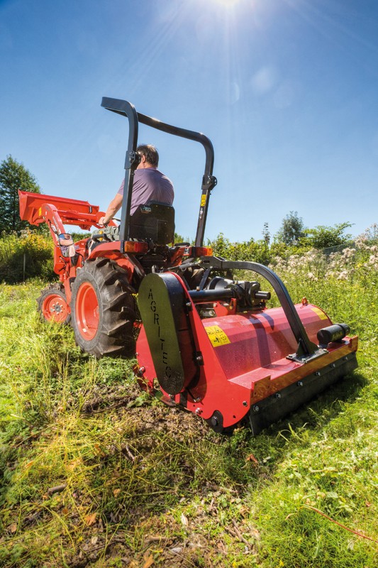 Unser Testfahrzeug war mit einem Schlegelmäher von Agritec ausgestattet. Dieser ist an die Zapfwelle angeschlossen und besitzt eine Schnittbreite von etwas über einem Meter. Dieses Mähwerk arbeitet äußerst effektiv und ist auch von Strauchwerk nicht zu stoppen. Vor dem Mähen sollte jedoch der Arbeitsbereich auf eventuelle Metalloder Schrottreste überprüft werden, da diese das Mähwerk beschädigen.