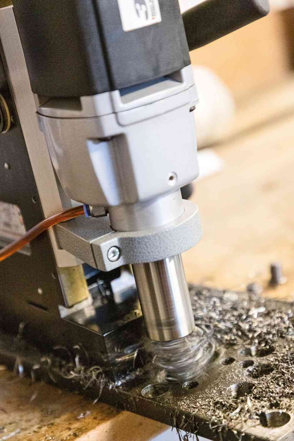 Wer erstmals mit der Maschine arbeitet, sollte vor Beginn die Bedienungsanleitung studieren. Die ist gut gemacht und erfreulich schnell durchgelesen. Für Neulinge mit dieser Maschinengattung stellt sich zum Beispiel die Frage, wie die Maschine korrekt angesetzt wird, denn es fehlt ja die bei Spiralbohrern übliche Zentrierspitze. Das ist nur zum Teil richtig, denn auch wenn hier mit einem ringförmigen Bohrer gebohrt wird, gibt es eine Mittenzentrierung, die federbelastet ist und zusammen mit der Bohrkrone in die Maschine eingesetzt wird. Damit kann man wie gewohnt auf dem markierten Körnerpunkt ansetzen. Für unsere Tests haben wir eine 16 mm dicke Baustahlplatte und einen 140-mm-Doppel-T-Träger „gelöchert“. Ich kann abschließend sagen, dass mir das Bohren mit großen Durchmessern selten so viel Spaß bereitet hat. Die Arbeit geht so einfach von der Hand wie noch nie. Nachdem die Maschine mit Strom versorgt ist, wird sie mit der Zentrierspitze passend ausgerichtet. Nun wird per Schalter der Elektromagnet eingeschaltet. Jetzt steht die Maschine unverrückbar fest. Kühlmittelzufuhr auf, Maschine am Maschinenschalter eingeschaltet, und los geht’s. Die Maschine lässt sich übrigens nur einschalten, wenn auch der Magnet in Betrieb ist. Jetzt kann mit dem Bedienen des Drehkreuzes ganz bequem gebohrt werden. Wenn der Bohrer durchbricht, wird durch den federbelastete Zentrierstift gleich der Bohrkern aus dem Bohrer gedrückt. Außerdem unterbricht der vorspringende Zentrierstift die Kühlmittelzufuhr. So bleibt die Arbeitsstelle sauber. Eine einfache und saubere Sache. Auch die Bohrung selber ist absolut sauber und frei von Graten. Unser einziger Kritikpunkt, der jedoch nur in Sonderfällen zutrift , ist die Funktion des Zentrierbolzens. Da dieser den Bohrkern automatisch ausdrückt, kann er unkontrolliert irgendwo hinfallen. Je nach Anwendung kann das zu Problemen führen. Noch ein Wort zu Bedienung und Verarbeitung. Wie eingangs erwähnt, empfiehlt sich ein kurzes Studium der Bedienungsanleitung, um die Besonderheiten, z.B. die Funktion des Zentrierbolzens, zu erfahren. Die eigentliche Maschinenbedienung ist selbsterklärend. Dafür braucht’s keine Bedienungsanleitung. Die Verarbeitung ist absolut sauber und hinterlässt den Eindruck, dass auch rauer Baustellenalltag klaglos weggesteckt wird. Ein Lob können wir für das fast 5 m lange Kabel aussprechen. In diesem Punkt sind viele andere Hersteller deutlich sparsamer. Die Tatsache, dass die Maschine komplett mit beinahe 100%iger Fertigungstiefe in Deutschland produziert wird, erhöht zwar den Preis, sorgt jedoch dank ebenfalls hier ansässigem Service für zügige Ersatzteillieferung bzw. Reparatur. Da fällt auch schon das wichtige Stichwort Preis. Was kostet der Spaß? Je nach Händler werden zwischen 550 und 600 Euro inklusive Mehrwertsteuer für die Anschaffung fällig.