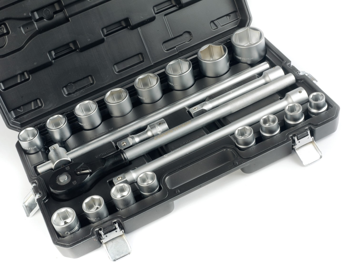 Das Set* besteht aus einer Ratsche mit ¾"-Antrieb und 24-zahnigem Antrieb. 3 Verlängerungen mit 80, 165 und 370 mm Länge sind ebenfalls im Set. Außerdem gibt es einen Knebel mit 490 mm Länge. Nüsse sind mit Schlüsselweiten von 19 mm bis 50 mm im Set. Verpackt ist alles in einem Kunststoffkoffer, der mit vier Schnappverschlüssen sicher verschlossen werden kann.