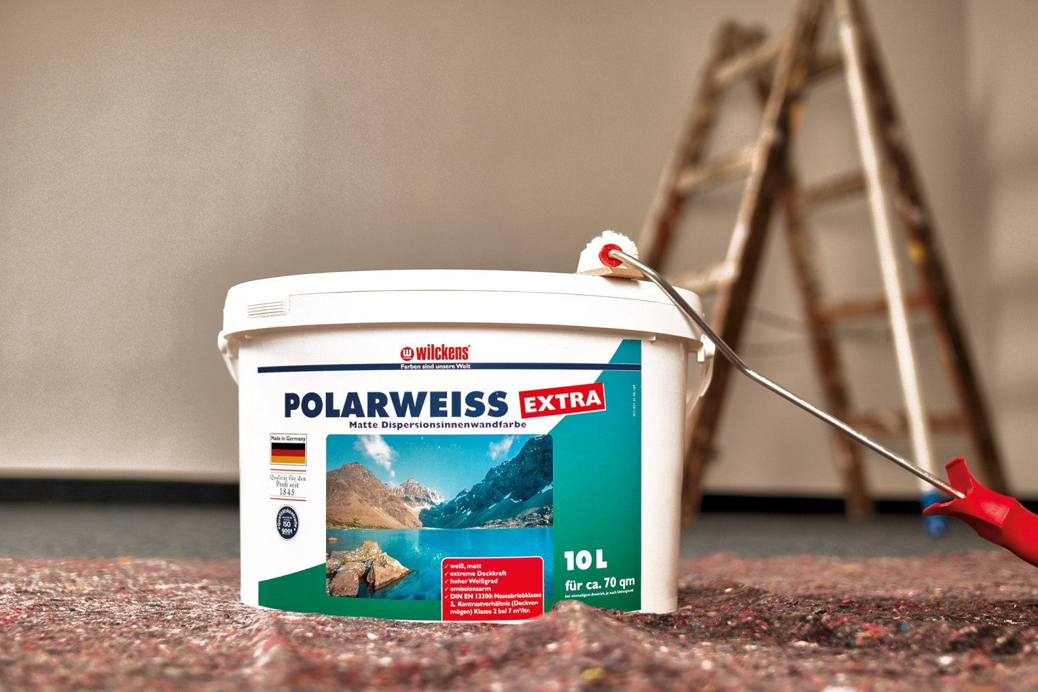 Ausstattung Bei den Gebindegrößen orientiert man sich an marktüblichen Gepflogenheiten, 5l und 10 L* sind übliche Größen für Wandfarben. Die Nassabriebklasse deklariert der Hersteller mit Klasse 3, die Deckkraft mit Klasse 2. Für den Erstanstrich kann die Farbe mit ca. 10% Wasser verdünnt werden. Polarweiss kann gestrichen, gerollt oder gespritzt werden. Mit Vollton- oder Abtönfarbe kann die Farbe nach Wunsch abgetönt werden. Der Glanzgrad ist matt.