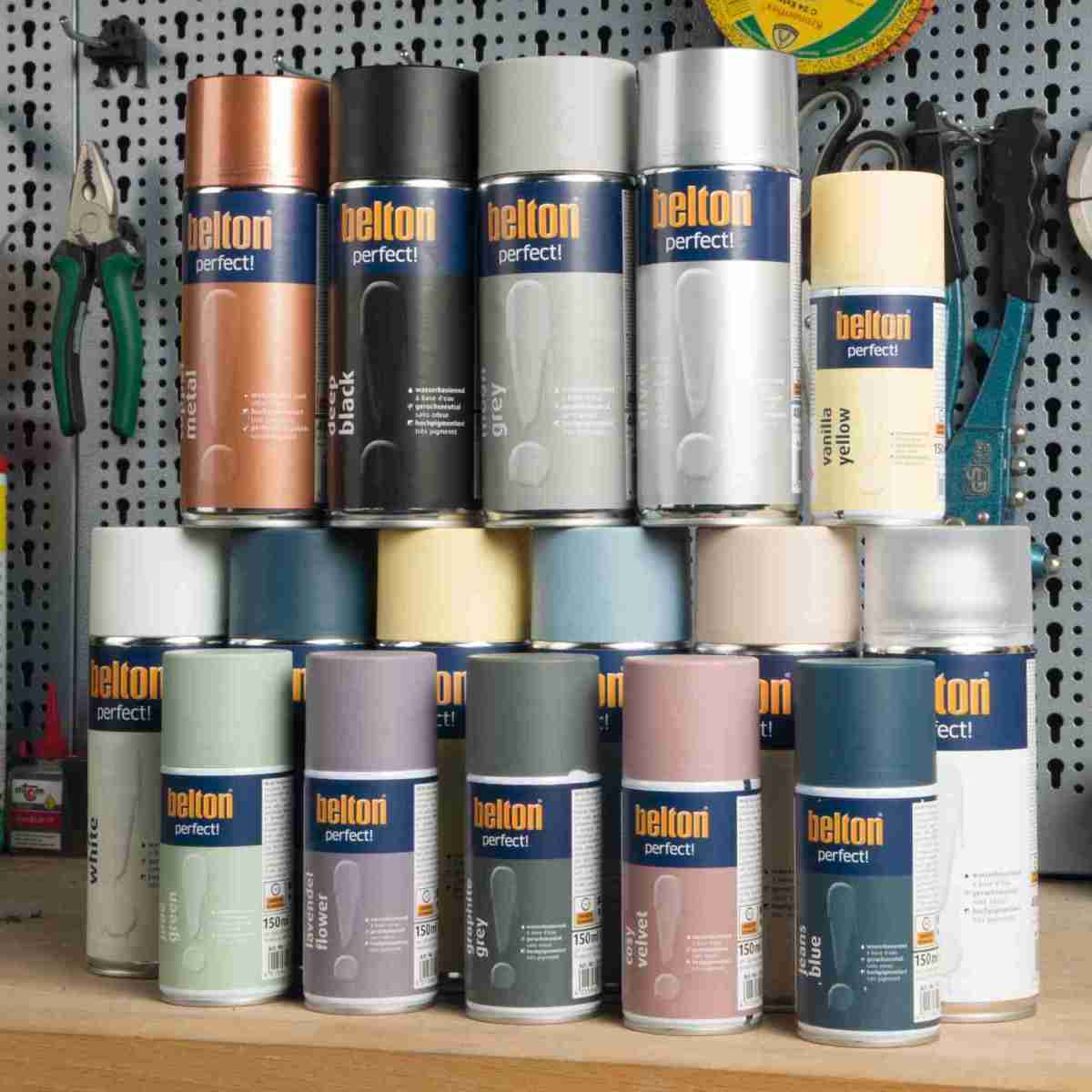 Die Belton Perfect-Farben* werden in den klassischen Sprühdosengrößen von 150 und 400 ml angeboten. Mit Ausnahme der Metallic Farbtöne sind alle anderen Farbtöne lösemittelfrei, und können sogar in Innenräumen verwendet werden.