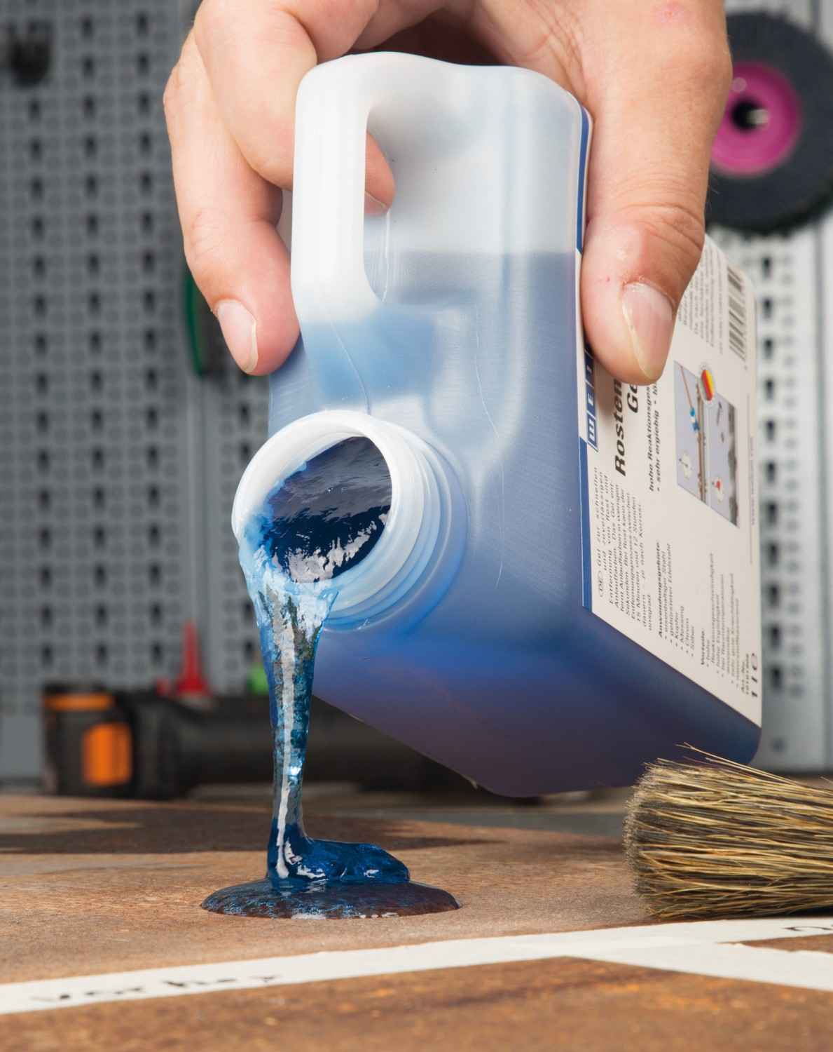 Das Gel* wird in Kanistern mit 1, 5, 10 und 28 Liter Inhalt angeboten. Der Auftrag geschieht mit Pinsel oder Rolle. Die Wirkung wird durch Verfärbungen auf der Fläche angezeigt. Ggf. ist ein weiterer Auftrag erforderlich. Nach 24 Stunden Wirkzeit wird das Gel mit klarem Wasser abgewaschen. Danach sollte die Fläche weiterbehandelt werden.
