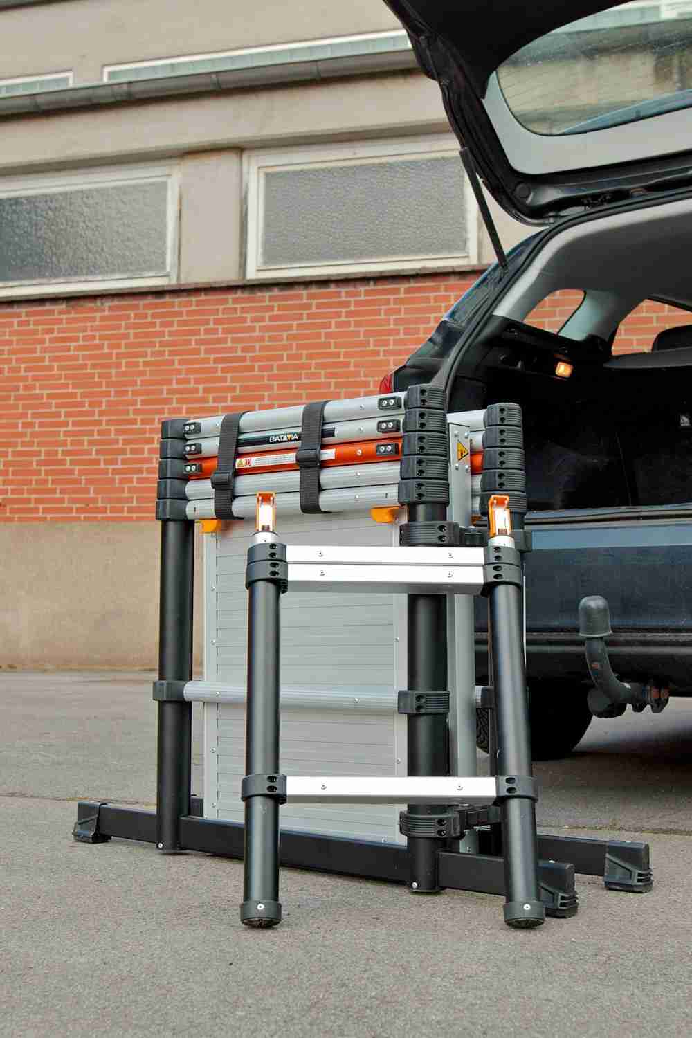 2 teleskopierbare Seitenteile ähnlich einer Teleskopleiter sind die Basis des Gerüsts. Die beiden Teile sind über ein faltbares Element fest miteinander verbunden. Vier ausziehbare Füße sorgen für die nötige Standsicherheit. Zwischen die beiden Seitenteile kann das ebenfalls klappbare und 1,2 m breite Arbeitspodest eingelegt werden. Die maximale Einlegehöhe für die Plattform ist 900 mm. Die entsprechende Sprosse in den Seitenelementen ist orangefarben eloxiert. Für einen bequemen Aufstieg bei weiter oben eingelegter Plattform gibt es eine kleine Teleskopleiter.