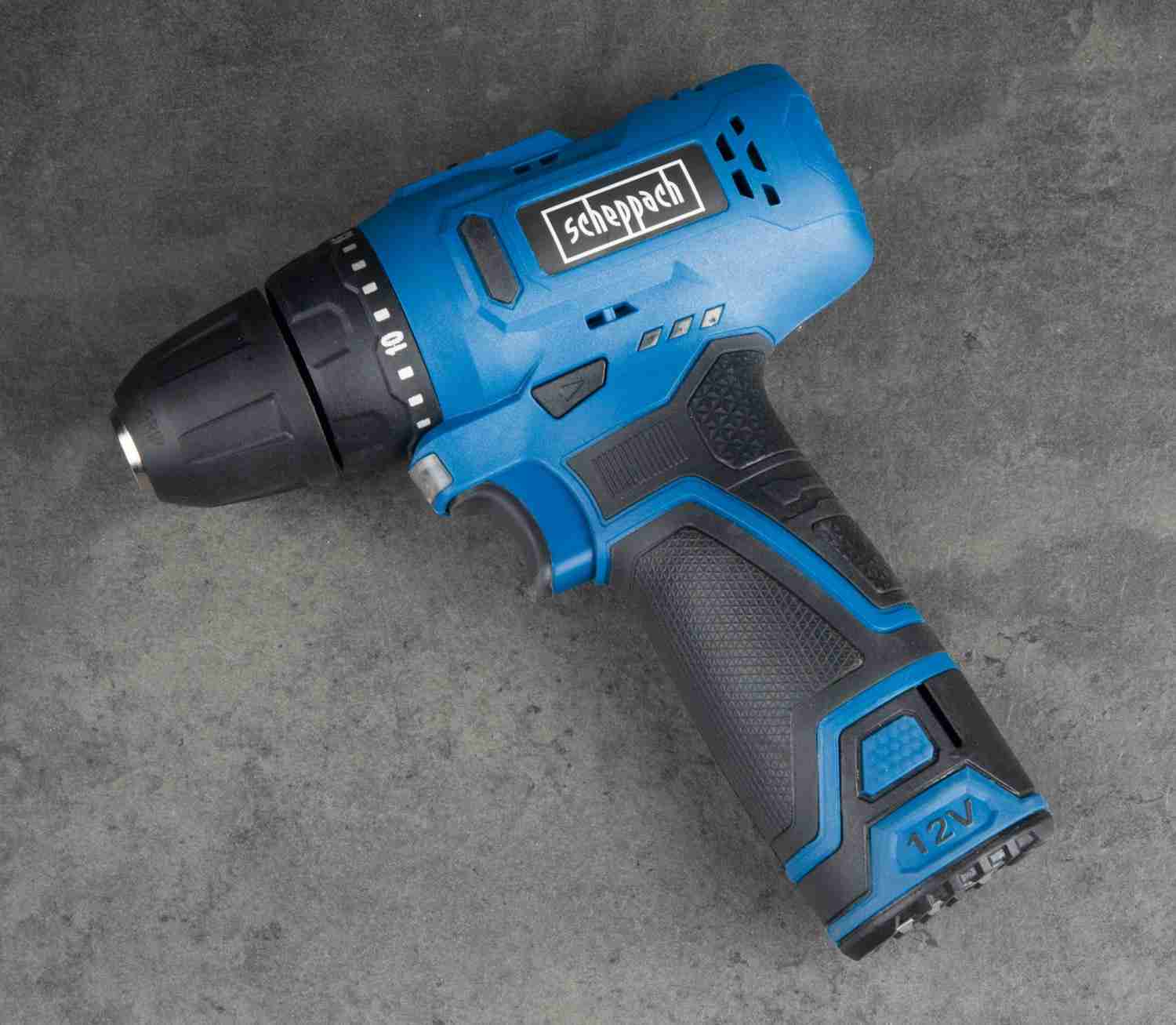 Der C-DTB74/2-12 von Scheppach wird mit umfangreichem Bohr- und Schraubzubehör ausgeliefert, Scheppach nennt das die kleine Werkstatt. Der 12 V-Motor mit Brushless-Technik ermöglicht ein maximales Drehmoment von 35 Newtonmetern, dabei verfügt er über ein Zweiganggetriebe mit jeweils 21 Drehmomentstufen. Zum Lieferumfang gehört ein zweiteiliger Kunststoffkoffer bei dem sich im oberen Fach das Bohr-Schraub-Zubehör befindet und unten die Maschine, zwei Akkus und das Ladegerät. Das Bohrfutter kann Bohrer mit einem Schaftdurchmesser bis 10 Millimetern aufnehmen. Vom Hersteller werden als maximale Bohrdurchmesser für Holz und Metall, 20 bzw. 8 Milli meter angegeben. Für Mauerwerk wird keine Wert angegeben.