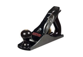 Für unseren Test haben wir uns für eine recht universell verwendbare Bauform entschieden, den Doppelhobel. Er liegt, was den Abtrag und die Oberflächengüte betrifft, zwischen dem Schlichthobel, der für höheren Abtrag ausgelegt ist, und dem Putzhobel, der vor allem eine besonders hohe Oberflächengüte liefert. Üblicherweise liegt die Breite des Hobelmessers hier zwischen 45 mm und 50 mm, die Sohlenlänge beträgt 240 – 260 mm und der Schneidwinkel des Hobels beträgt 45°. Die Maulöffnung ist bereits sehr fein und ein Doppelhobel hat einen Spanbrecher, also ein zweites Eisen, das ihm den Namen gegeben hat. Das Maul ist schon vergleichsweise eng, um eine feine Spanabnahme und eine gute Oberfläche zu erzielen.